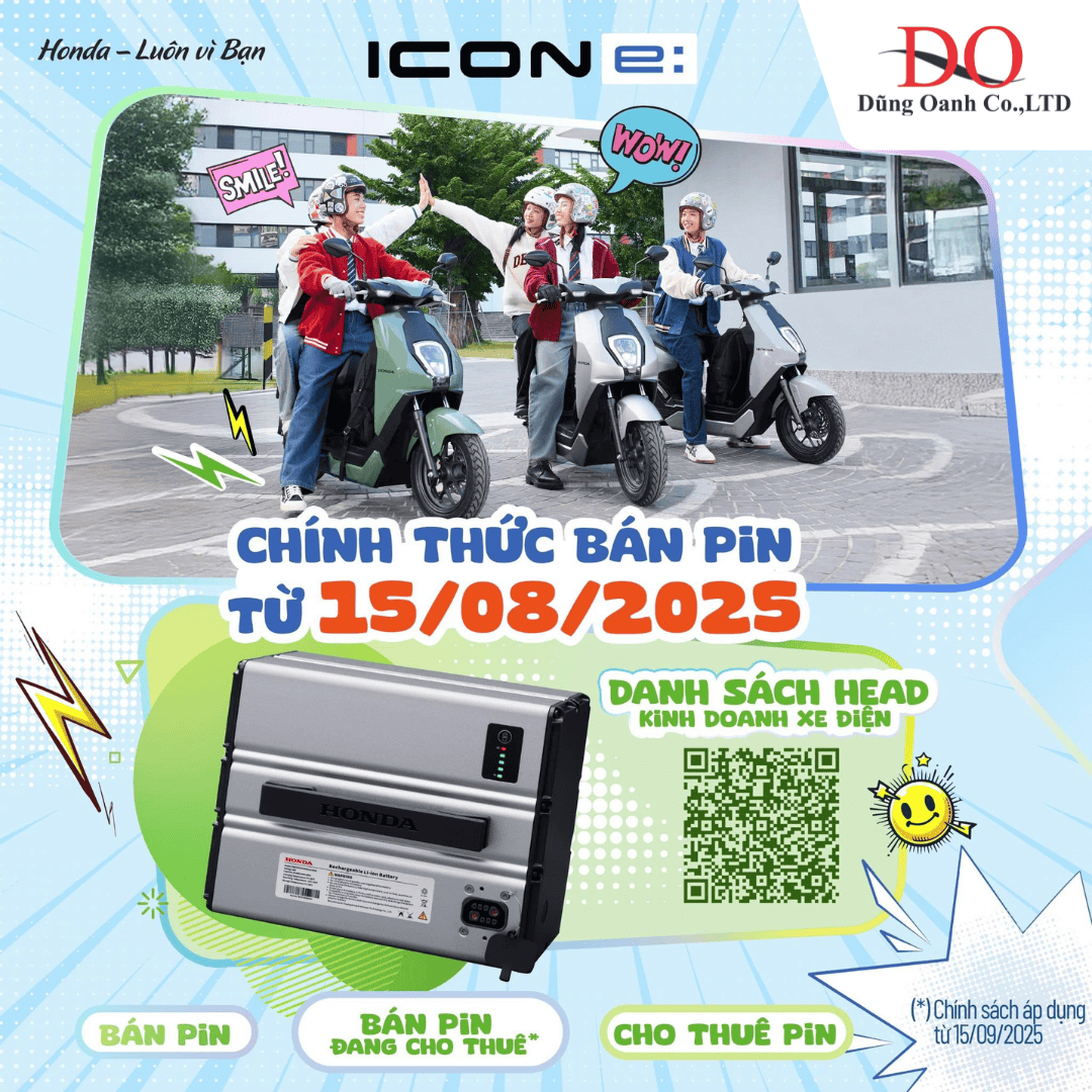 Nhằm mang đến cho khách hàng sự linh hoạt tối đa khi có thể mua hoặc thuê pin tùy nhu cầu, bên cạnh "Chính sách cho thuê pin" đang triển khai, HVN áp dụng "Chính sách Bán pin kèm theo xe gắn máy điện Honda ICON e:" từ ngày 15/8/2025, với mức giá 9.621.818 VNĐ/pin (VAT 8%) hoặc 9.800.000 VNĐ/pin (VAT 10%).
