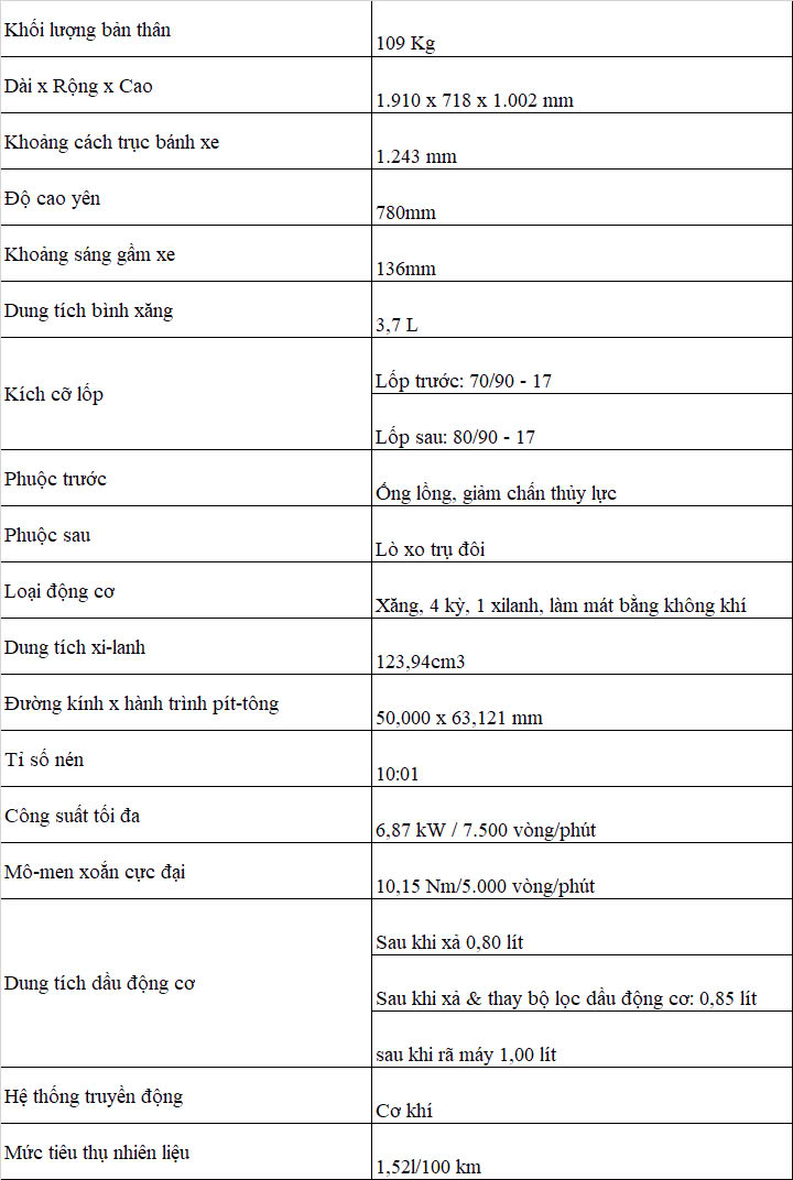 Động cơ dung tích 125cc, SOHC, trang bị PGM-FI, đạt công suất tối đa 6,87kW và mô men xoắn cực đại 10,15Nm mang lại khả năng vận hành mạnh mẽ và tiết kiệm nhiên liệu tối ưu