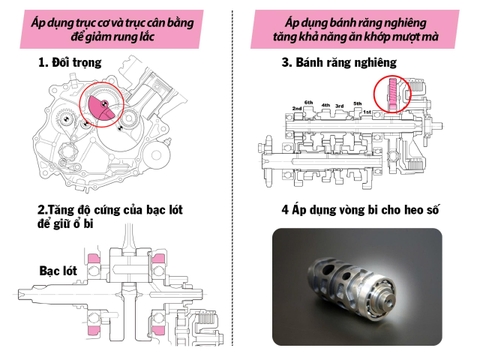 WINNER R áp dụng công nghệ giảm rung lắc với trục cơ và trục cân bằng kết hợp bạc lót để giữ ổ bi, đồng thời giảm thiểu tiếng ồn nhờ bánh răng nghiêng và vòng bi cho heo số, mang đến cảm giác vận hành êm ái và mượt mà.