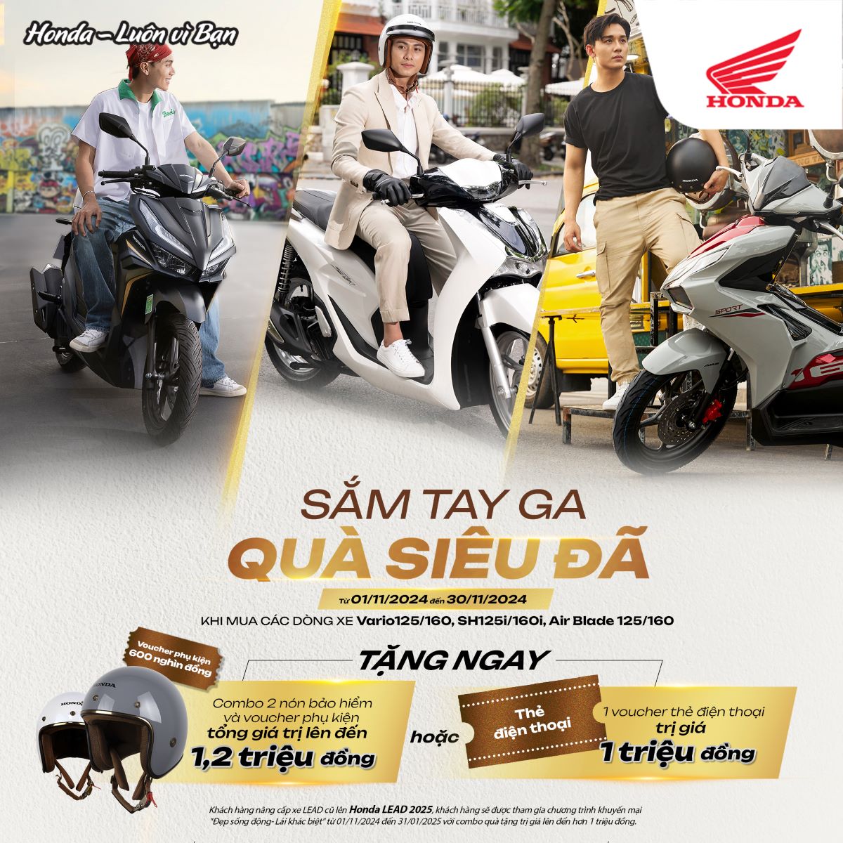 Khuyến mãi tháng 11 đổ bộ với vô vàn quà tặng hấp dẫn. Áp dụng với các dòng xe Vario125/160, Air Blade 125/160, SH125i/160i.