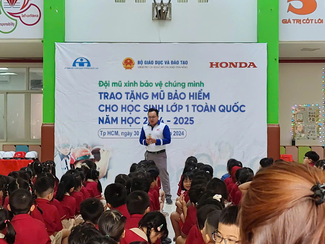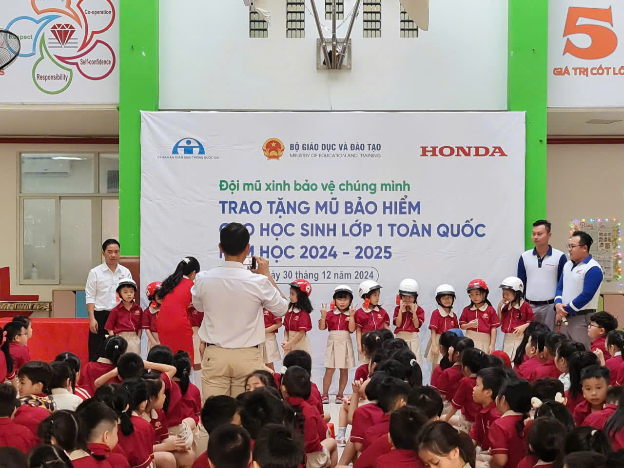 Thực hiện Kế hoạch của Ủy ban An toàn giao thông (ATGT) Quốc gia về trao tặng Mũ bảo hiểm cho trẻ em năm 2024 với chủ đề “Giữ trọn ước mơ”; Sáng ngày 30/12/2024 HEAD Dũng Oanh phối hợp tổ chức trao tặng Mũ bảo hiểm cho các em học sinh lớp Một tại trường Tiểu học Hồng Ngọc